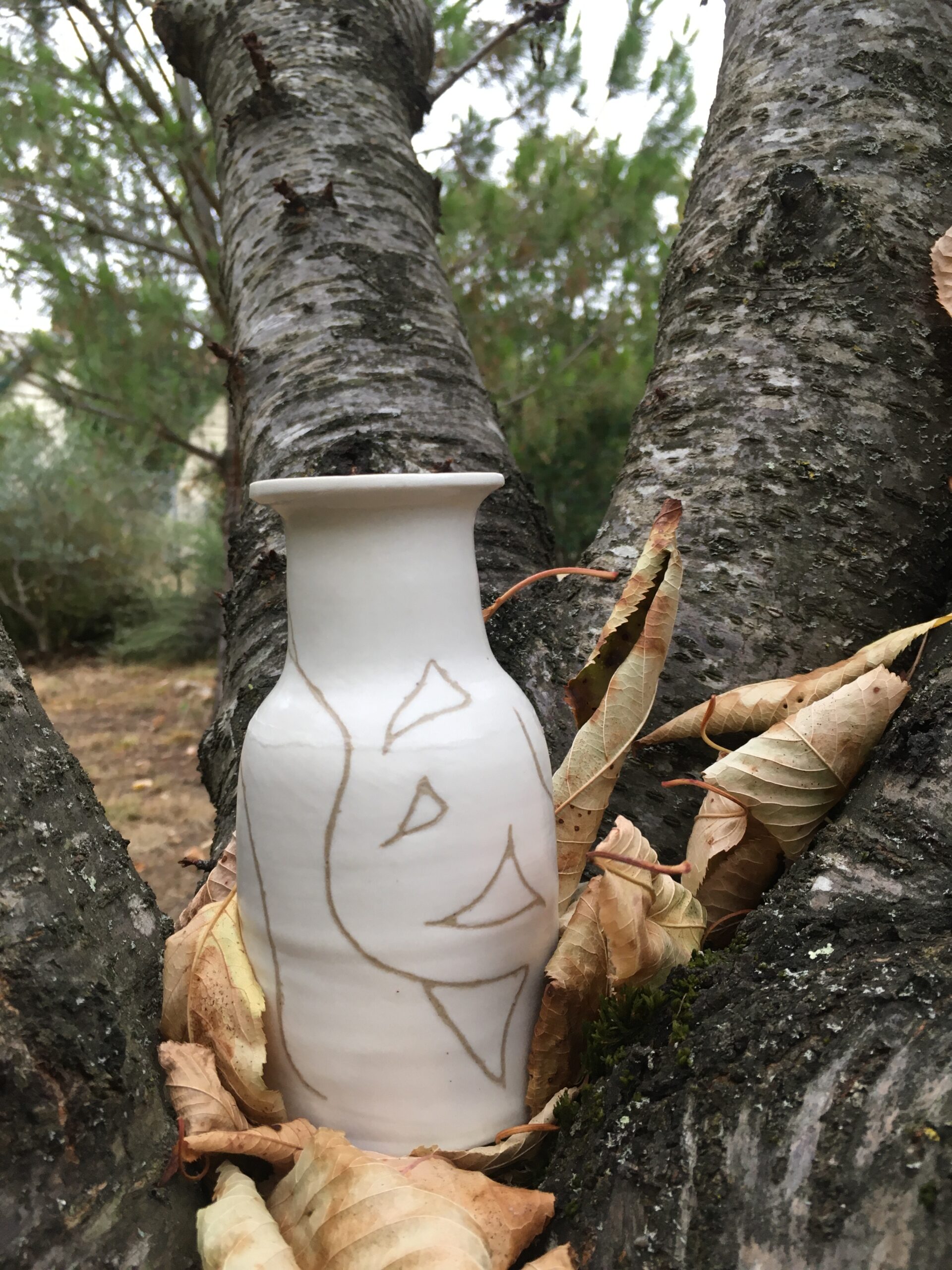 Lignes fines de manganèse léger formant arabesques, gravées, incrustées dans la matière, rappelant les techniques japonaise du Mishima, tracent un réseau subtil.